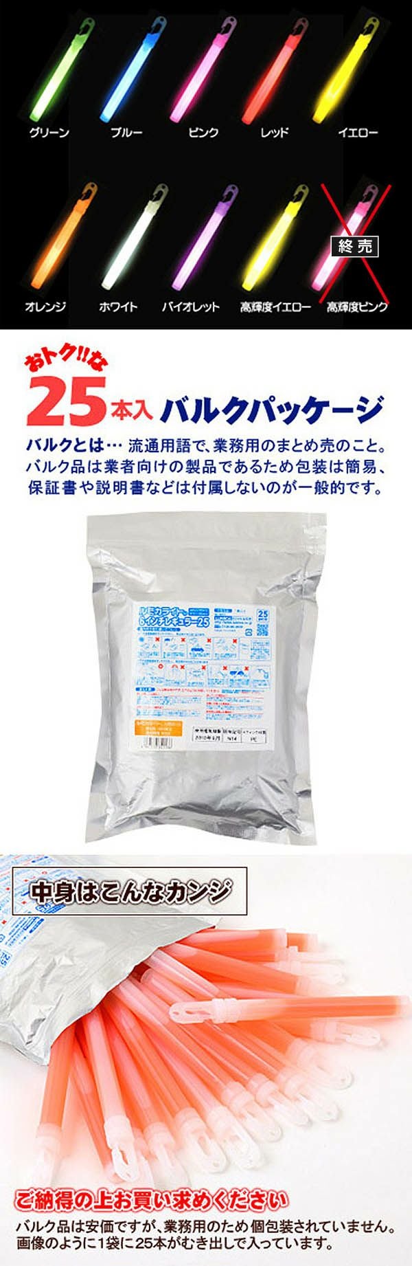 他の画像を見る 1本あたり約90.9円(100円税込)x25本入=2273円(2500円税込)国内最高品質発光体 6インチ ルミカライト ケミカルライト サイリューム ルミカライトレギュラー 業務用 バルクタイプ 6インチ 25本入 { ルミカ ケミカルライト サイリウム ペンライト まとめ買い 大量 }{ 光るおもちゃ パーティーグッズ ライブ アイドル 結婚式 }[SKB][24L04][dmo]{即日出荷 配送区分D} メーカー希望小売価格 ¥ 4,950 のところ 当店特別価格 ¥ 2,500 税込 カートに入れる お気に入りに登録する
