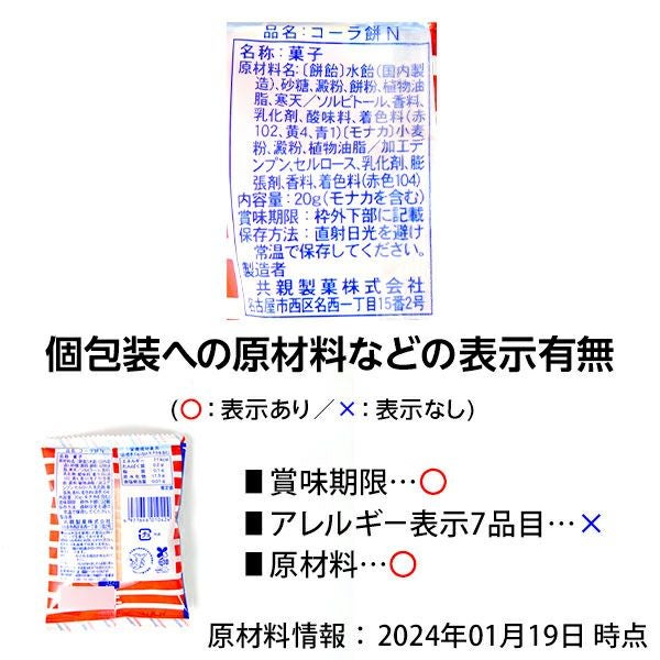 他の画像を見る 単価34円(約36.7円税込)x24個装入=816円(881円税込)楊枝でちょこちょこ刺して食べる楽しみ♪ コーラ餅 24個装入 { 駄菓子 お菓子 コーラ 餅 もち グミ 最中 もなか }{ 駄菓子 お菓子 おかし おやつ 景品 お祭り 縁日 問屋 子供 子供会 自治会 お子様ランチ 詰め合わせ 大量 まとめ買い 保育園 幼稚園 パーティー イベント 配布 }[24A19] メーカー希望小売価格 ¥ 1,037 のところ 当店特別価格 ¥ 881 税込 カートに入れる お気に入りに登録する