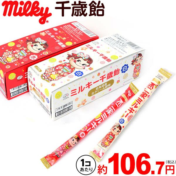 他の画像を見る 送料無料!!1本あたり約112.3円(約121.2円税込)x40本入=4490円(4849円税込) 不二家 40本セット ミルキー 千歳飴 (赤20本、白20本) 40本入 { 駄菓子 お菓子 七五三 お祝い 飴 千歳あめ 紅白 お祝い ペコちゃん }{ おかし 幼稚園 保育園 神社 }[25H21][dmo] 送料無料(※沖縄県は送料要) メーカー希望小売価格 オープン価格 のところ 当店特別価格 ¥ 4,849 税込 在庫切れ 再入荷お知らせ お気に入りに登録する