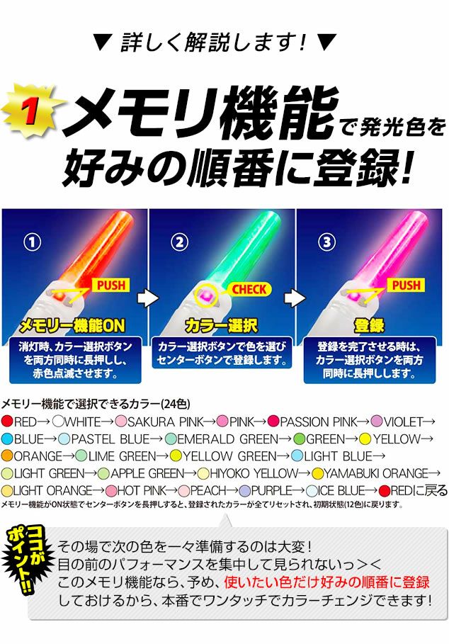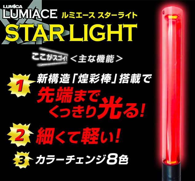 他の画像を見る 40%OFF!! ルミカ ルミエース スターライト (LUMICA LUMIACE STARLIGHT) カラーチェンジ 8色 (電池LED) { ルミカライト 電池式 ペンライト LED }{ ライブ フェス コンサート アイドル 結婚式 二次会 パーティー パーティーグッズ }[23K15]{即日出荷 配送区分D} メーカー希望小売価格 ¥ 1,650 のところ 当店特別価格 ¥ 990 税込 カートに入れる お気に入りに登録する